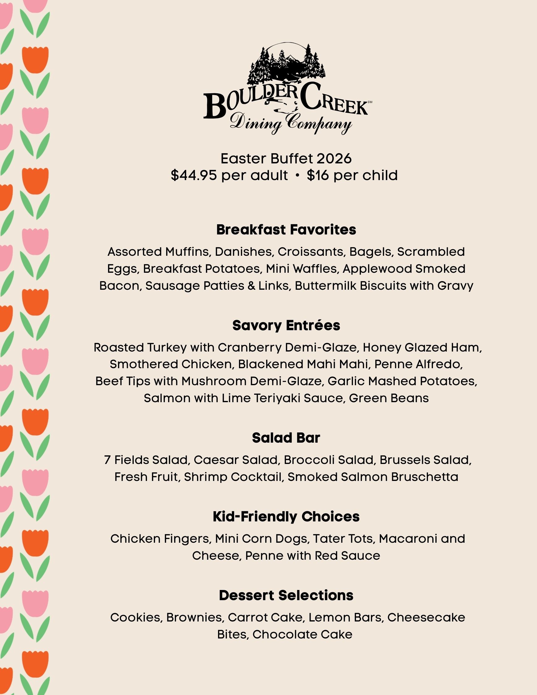 Boulder Creek Dining Brunch Buffet *Dinner menu available 3:00 PM - 9:00 PM | Charbonos Brunch Buffet *Dinner menu available 3:00 PM - 9:00 PM |