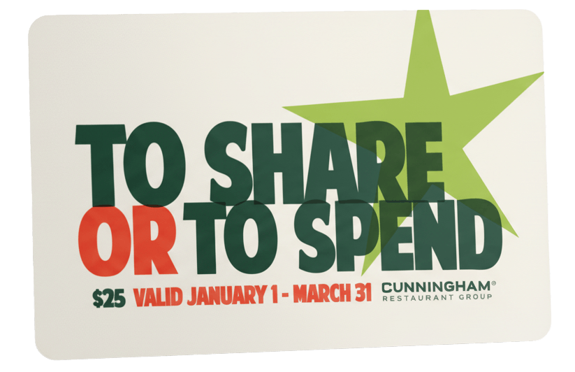 This season, let’s eat, drink and be together— because we know some of life’s best moments happen around the table. Now through December 31, for every $125 you spend on gift cards, you will receive a $25 bonus. Mix and match $125. There is no limit, the more you buy, the more bonus cards you earn!
